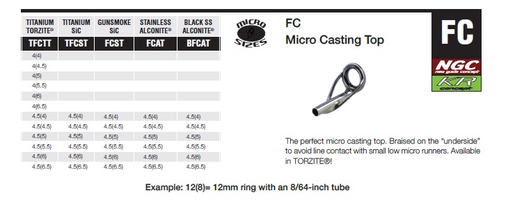 Fuji Micro Casting Guides--ALCONITE RING Fuji Micro Casting Guides Fuji Series FC tops in small sizes are perfect for micro casting rod builds where stresses call for a bottom welded frame. FC tops feature this frame design to create a smooth surface on the top of the casting rods to reduce possible snags and increase strength. Available in 4.5mm ring size in SIC Torzite and Alconite ring materials.